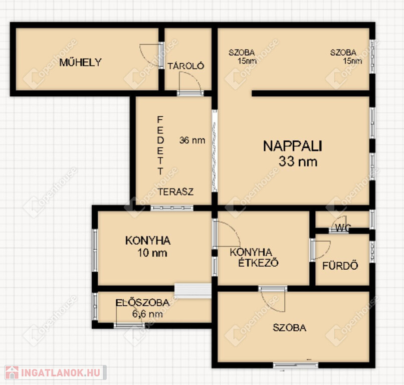 Belső elrendezése jelen kialakításában: előszoba, konyha-étkező, kényelmes méretű szoba, fürdőszoba és külön wc.