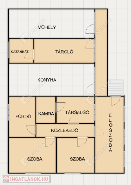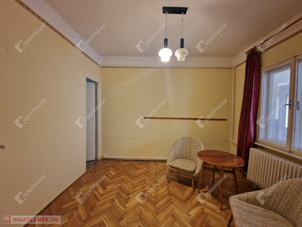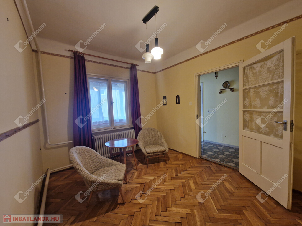 Belső elrendezése jelenlegi kialakításában: előszoba, közlekedő,két külön nyíló kényelmes méretű szoba, társalgó, fürdőszoba, kamra.