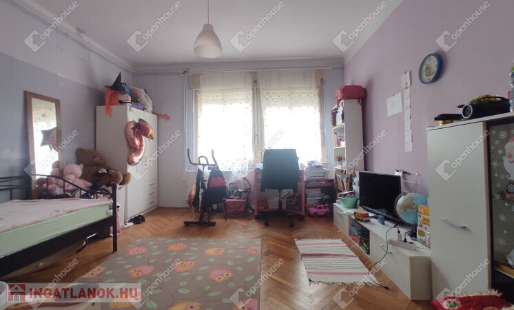 Belső elrendezése jelen kialakításában: előszoba-közlekedő, étkező, nappali, konyha, fürdőszoba, három külön nyíló kényelmes méretű szoba.