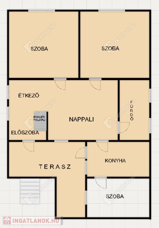 Bejárata előterében kényelmes kialakítású terasz, mely két bejárást biztosít az ingatlanba.