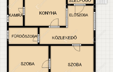 Elosztás: két szoba, konyha, kamra, közlekedő, előszoba, fürdőszoba